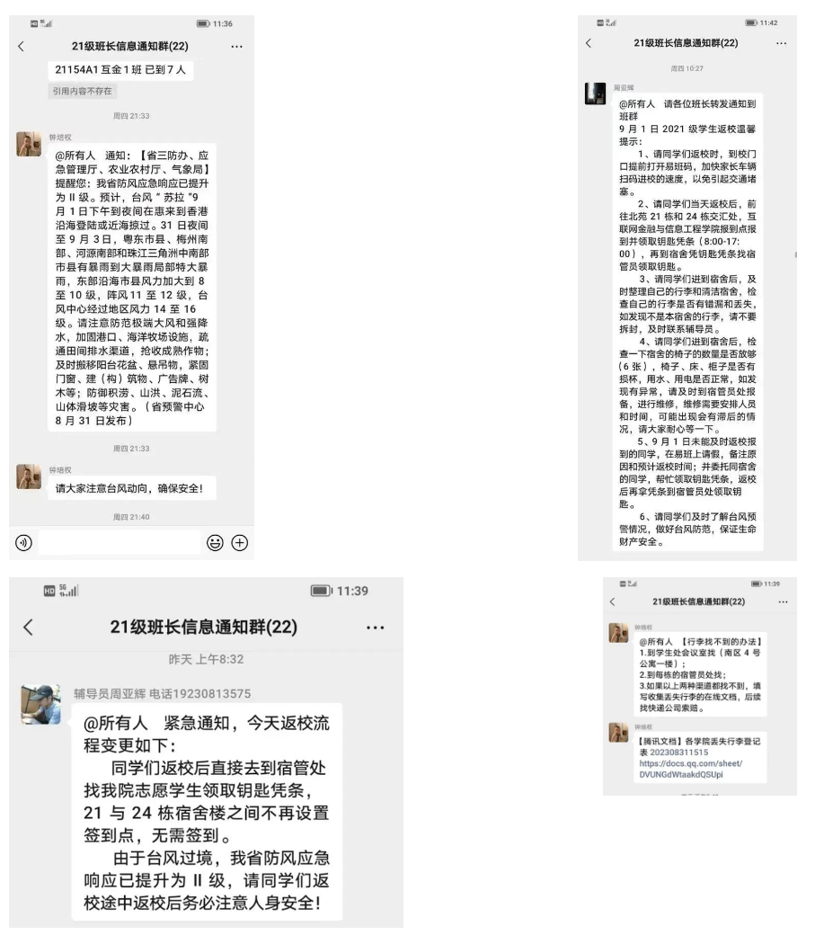 由于本次返校日期与台风“苏拉”登陆时间较接近,部分同学受台风影响无法按时返校。学院领导和21级辅导员们提前统计好不能正常返校的学生名单,做好安抚和关注工作,同时提醒其他同学返校途中注意安全。