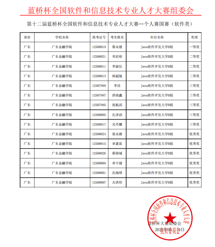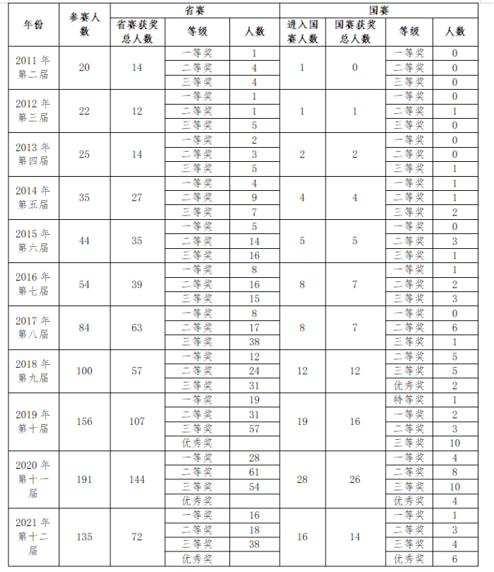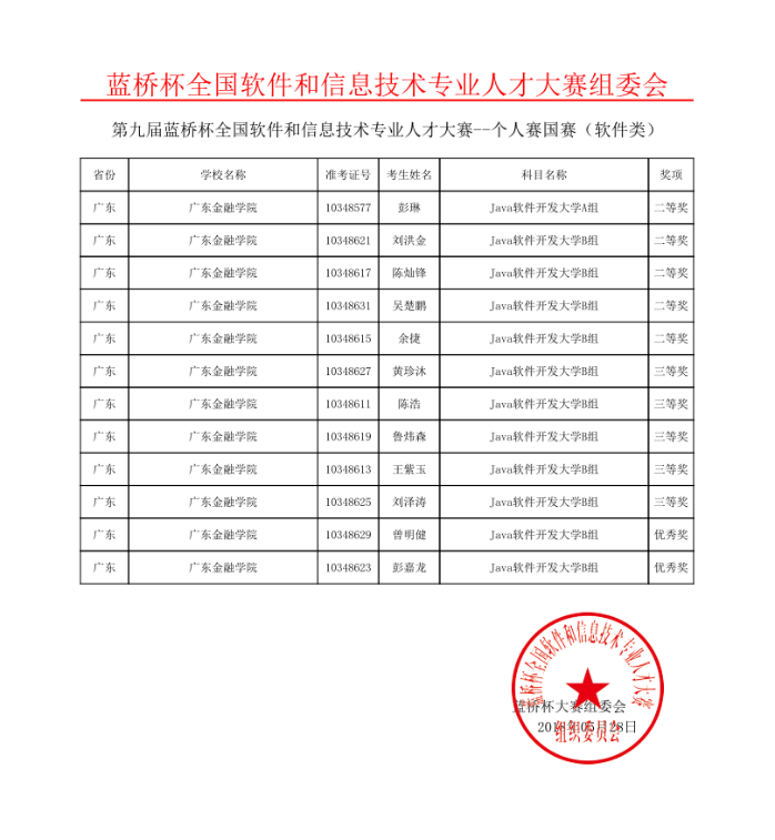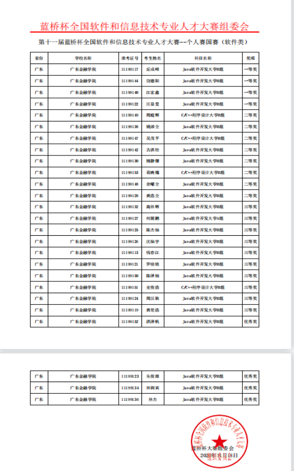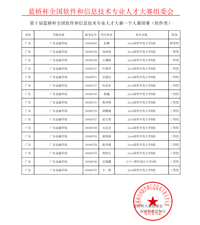 互联网金融与信息工程学院全国软件大赛“蓝桥杯”荣誉一览表