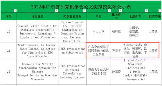 近日,2022年广东省计算机学会优秀论文评选结果出炉,我院齐菲菲老师及其团队以题为《Spatiotemporal-Filtering-Based Channel Selection for Single-Trial EEG Classification》的论文,荣获二等奖。