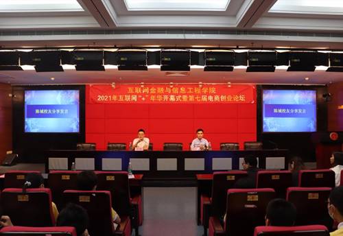 4月27日,互联网金融与信息工程学院在教学实验中心二楼国际学术报告厅举办2021年互联网“+”年华暨第七届“电商创业讲坛”,以全新的面貌拉开了2021年度校园文化活动的序幕。招生与就业处处长王中志、校团委书记许丽华、教务处副处长于大川、学生处副处长容志豪以及互联网金融与信息工程学院院长吴炎太、党总支书记朱小焱、党总支副书记丘志君等出席了开幕式,讲坛邀请了2020、2021届优秀创业代表陈城、林尚源作创业经验分享,200多名师生代表参与活动,活动由王思又老师主持。