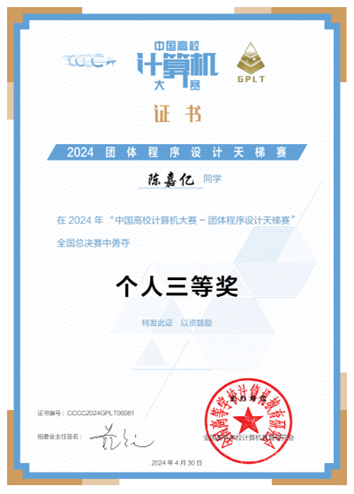 4月20日,第9届 (2024年)“中国高校计算机大赛——团体程序设计天梯赛”线上赛落下帷幕。本次比赛吸引了包括清华大学、北京大学、南京大学、复旦大学等在内的全国31个省级行政区580所高校组成的1865支队伍,共18546名学生参赛。参赛组别由难到易分为珠峰争鼎(本科组)、华山论剑(本科组)、沧海竞舟(专科组)。我院陈嘉亿、徐展鹏、曾梓航、杨煌、廖斌楷、曹家豪、李林清、王桂坤、冯帅、吴玮琦等10位同学组队参加了珠峰争鼎组比赛。经过五个小时激烈角逐,喜获广东省团队三等奖、广东省高校三等奖,陈嘉亿同学还获得全国总决赛个人三等奖的好成绩。