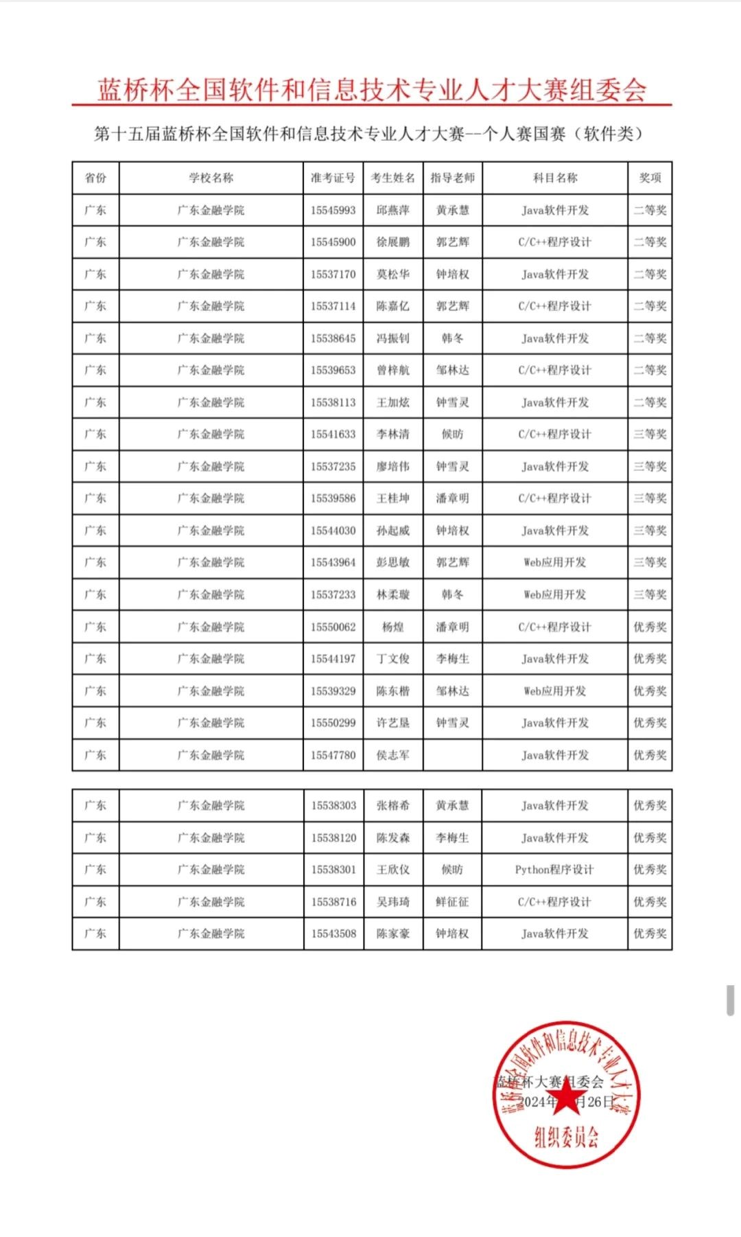 近日,第十五届“蓝桥杯”全国软件和信息技术专业人才大赛个人赛国赛在全国各省会城市举行,我院互联网金融与信息工程学院25名省赛一等奖选手参加了比赛,共有23名选手获奖。