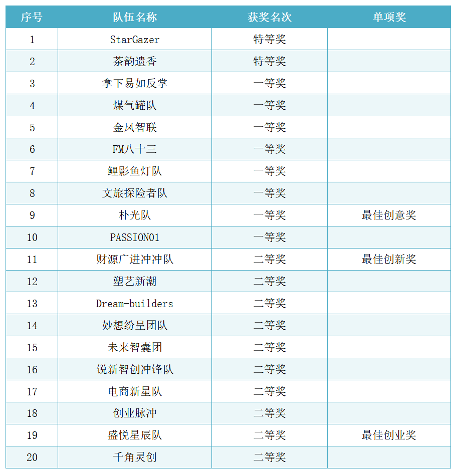 最终,经过评委的细致评审与充分讨论,大赛共评选出特等奖2项、一等奖8项、二等奖10项,以及最佳创意奖、最佳创新奖和最佳创业奖各1项。StarGazer队与茶韵遗香队荣获特等奖;煤气罐队等8支队伍获得一等奖;塑艺新潮队等10支队伍获得二等奖;朴光队、财源广进冲冲队、盛悦星辰队则分别摘得最佳创意奖、最佳创新奖和最佳创业奖。(下附具体获奖名单)