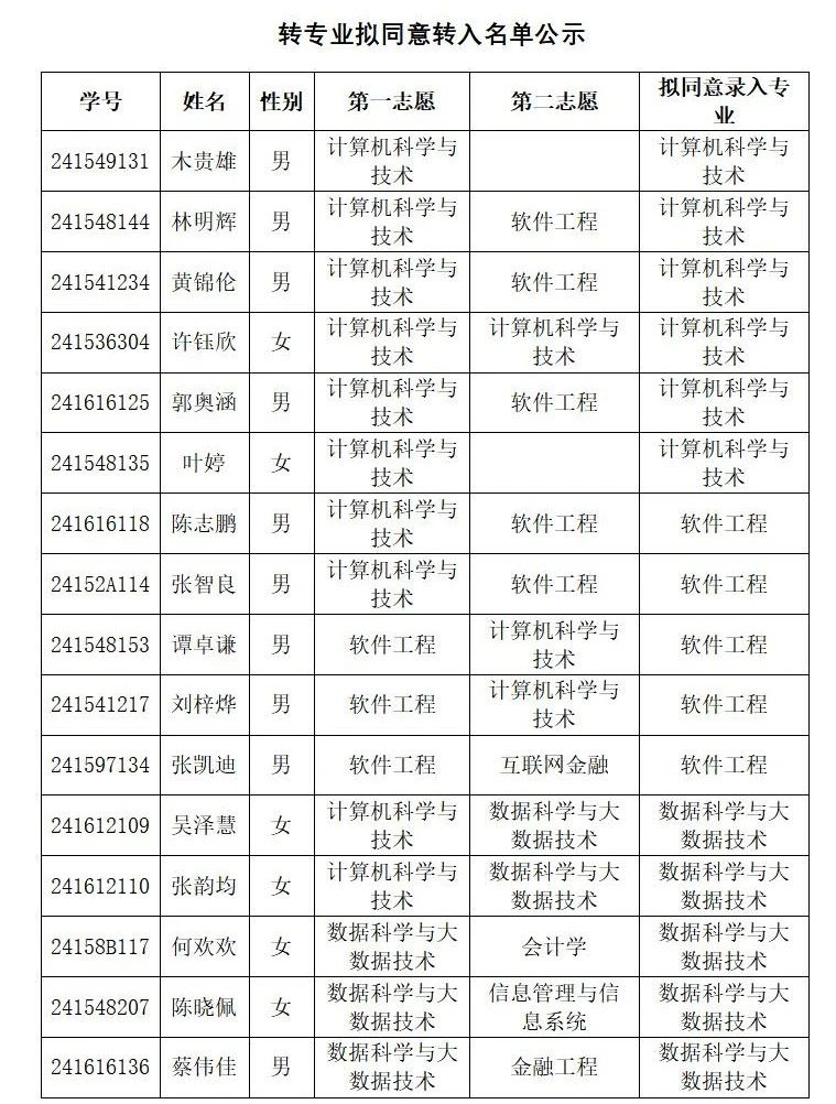据《广东金融学院学生管理规定》、《广东金融学院全日制本科学生转专业管理办法》、《广东金融学院2024级全日制本科生转专业实施方案》和《互联网金融与信息工程学院2024级全日制普通本科生转专业实施方案》的规定,经学生本人申请,转出学院初审,互联网学院转专业工作小组对申报我院的转专业学生进行了资格审核和考核筛选,现将我院审核情况予以公示。
